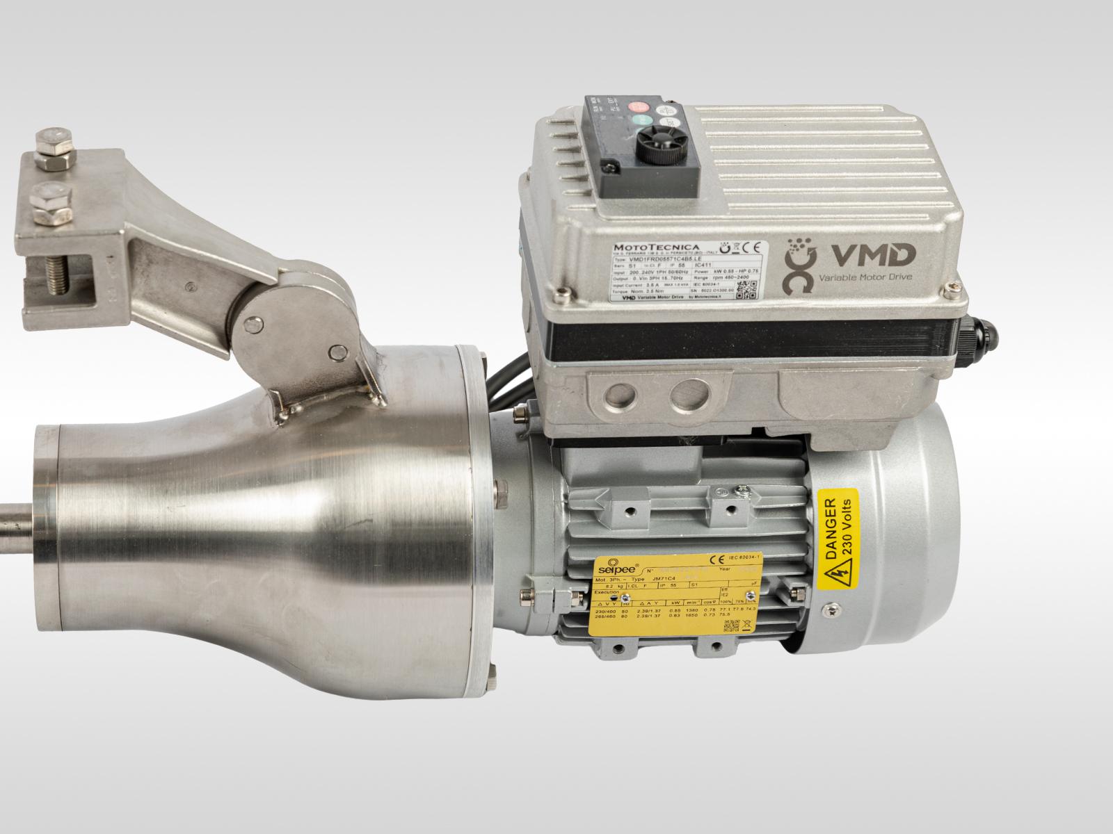 - Motoinverter trifase IP55, alimentato 220/380V - 50 Hz, disponibile 2 poli con velocità 900-4200 rpm, 4 poli con velocità 450-2100 rpm, 6 poli con velocità 300-1400 rpm, e con potenza da 0.25 fino a 3 Hp;